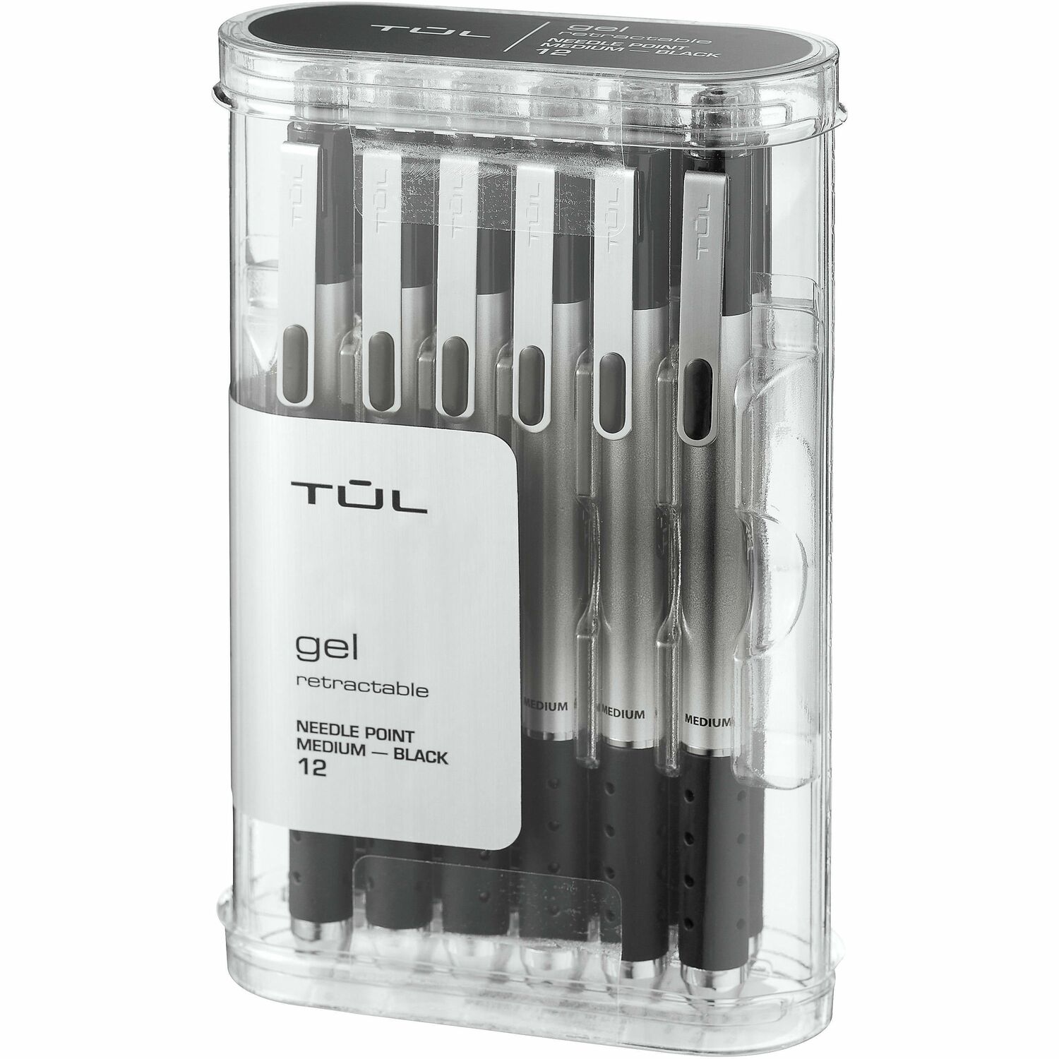 TUL® GL Series Retractable Gel Pens, Needle Point, 0.7 mm, Silver Barrel, Black Ink, Pack Of 12 Pens