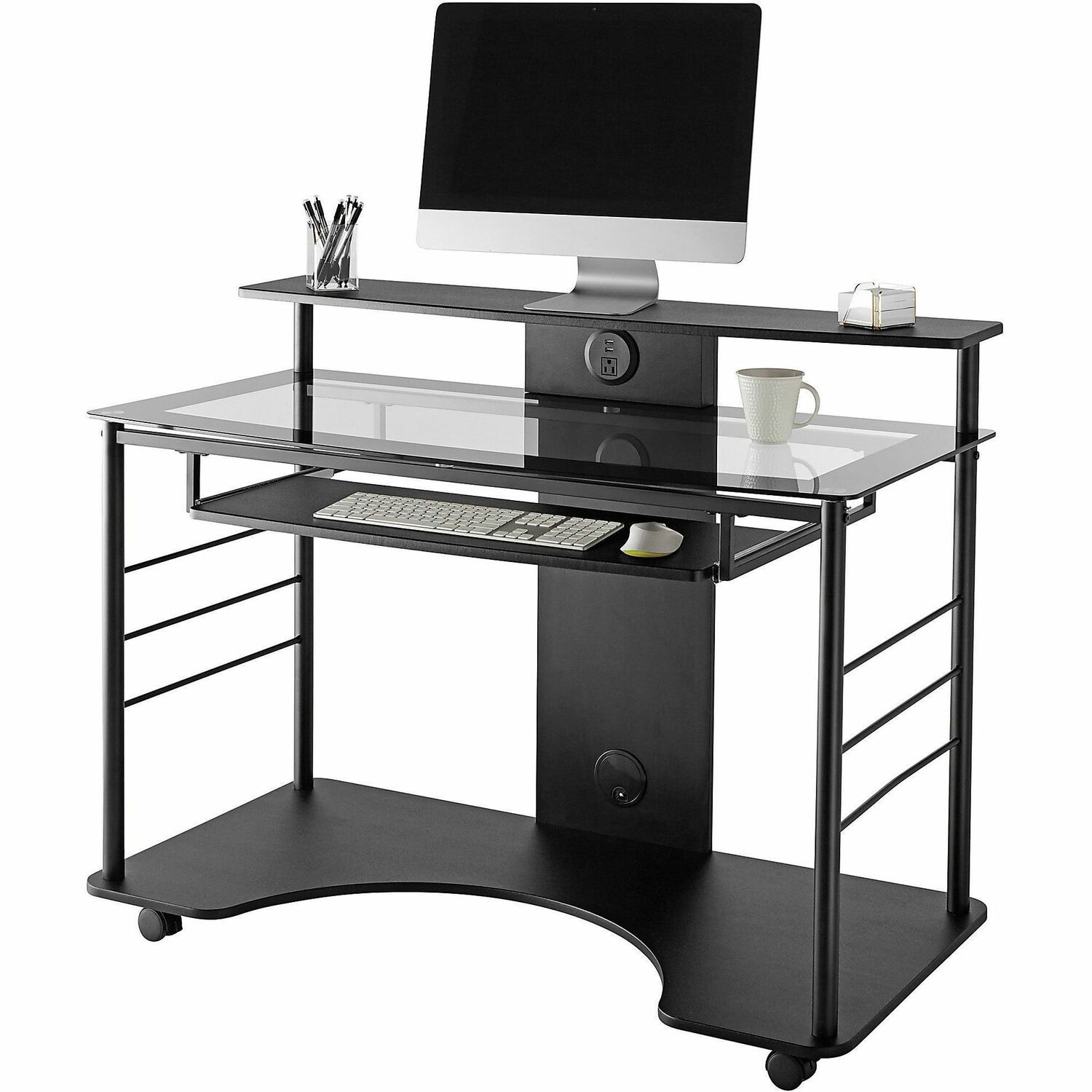 - Tempered glass monitor shelf delivers upscale style and durability.